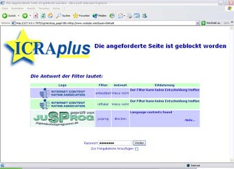 Der voreingestellte Filter verbirgt automatisch Webadressen, die Gewalt, Pornografie oder vulgäre Sprache beinhalten. Surft der Nachwuchs auf kritische Internetseiten, zeigt ICRAplus/JusProg-Filter statt der Seite einen Warnhinweis an: Man erfährt, welcher Filter die Adresse geblockt hat und aus welchen Gründen. Mit dem Überbrückungspasswort überspringt man gegebenenfalls den Warnhinweis und gelangt zu der zuvor geblockten Adresse. So passen Eltern die Voreinstellungen mit der Zeit an die jeweiligen Bedürfnisse ihrer Kinder an.
